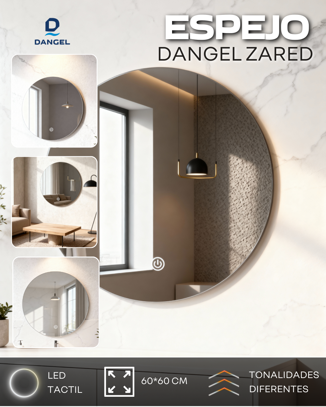 ✅ Espejo Zared 60×60 – redondo, alta definición, sistema táctil y cambio de luz en 3 tonos: cálida, fría y neutra