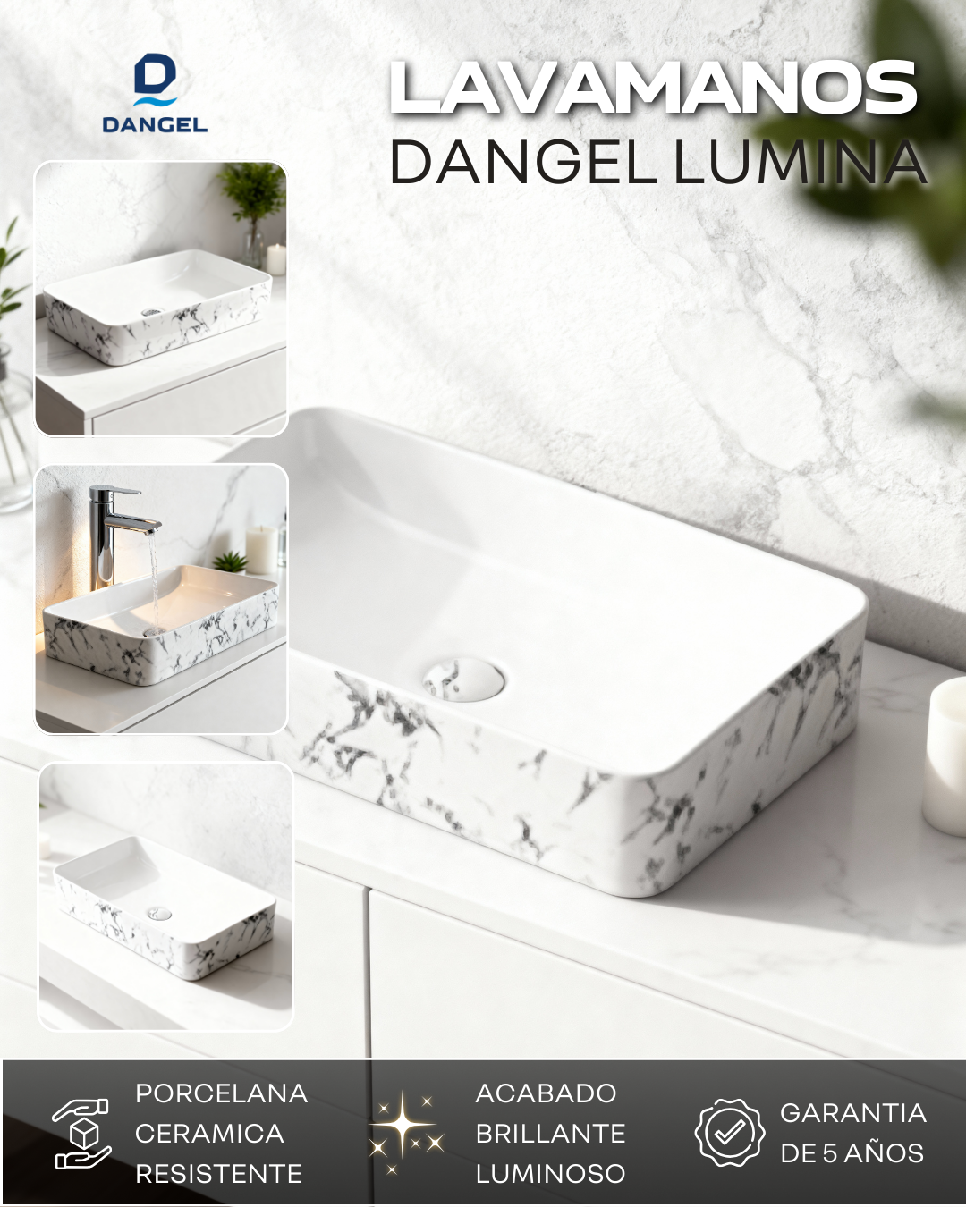 ✅ Lavamanos Lumina – porcelana blanca tipo mármol, apariencia pulida y elegante